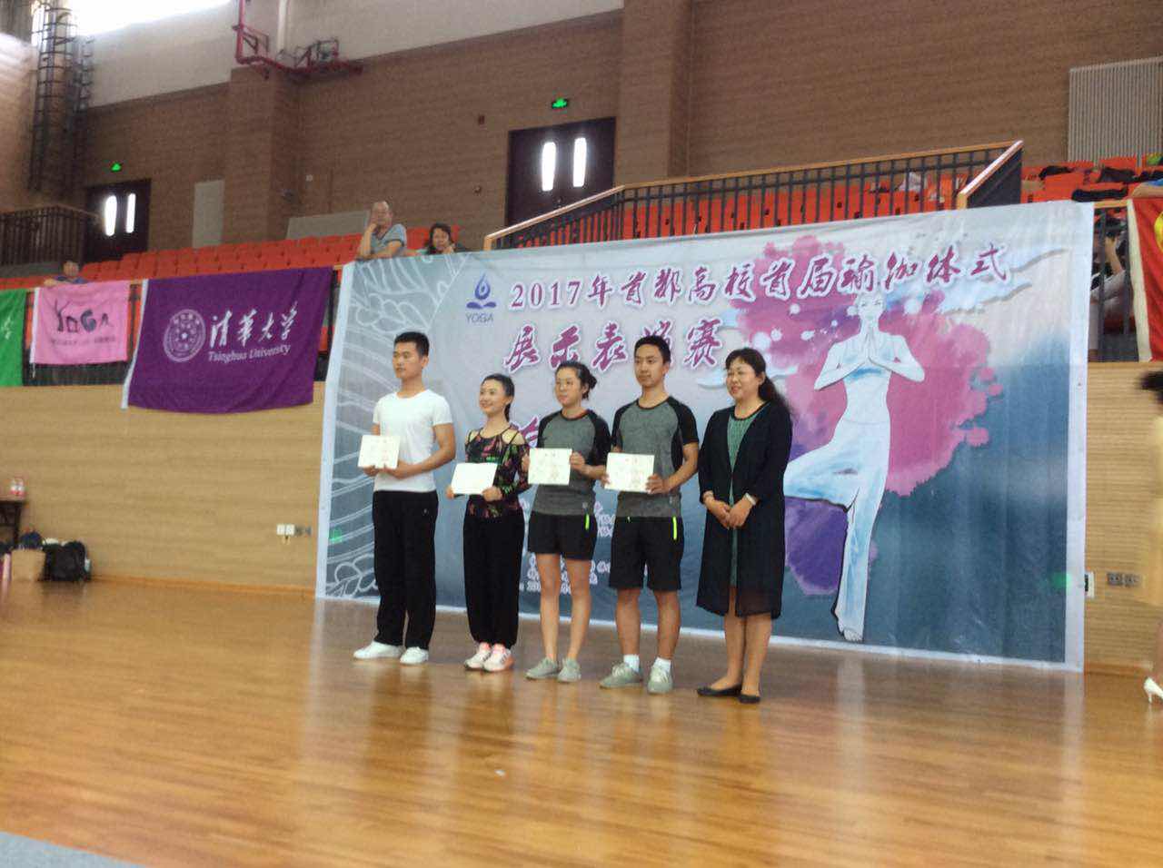 各校运动员身着瑜伽表演服,或是裙裾飘飘,或是青春健美,伴随着宁静优雅的瑜伽背景乐,组合变换着一个又一个赏心悦目的瑜伽体式: 伸展、拧 转、力量、平衡。整个赛场洋溢着轻松愉悦的气息。 我校由体育部的王娟老师和蔡晓竹老师带队参加了本次比赛的四个项目