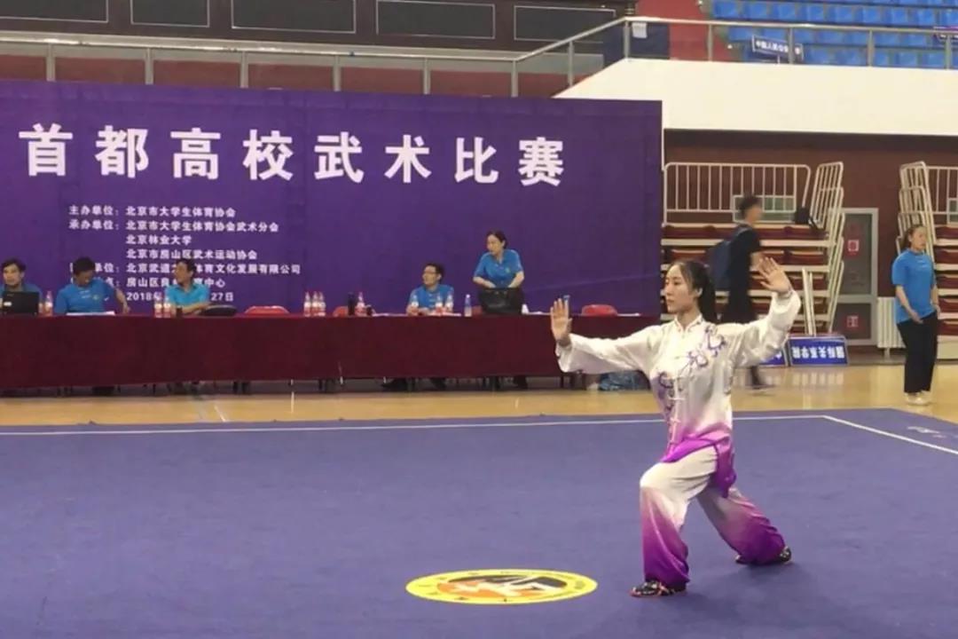 2016级研究生倪宏飞第八年代表我校参加首都高校比赛,获得女子自选棍术冠军,女子自选长拳冠军,女子自选刀术亚军,在队八年战果累累,在毕业季前完美收官。