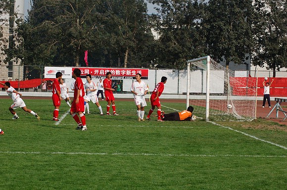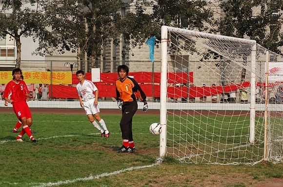 比赛刚刚开始,我校足球队便展开了猛烈的攻势,几乎将天津东丽队压在了自己的半场。