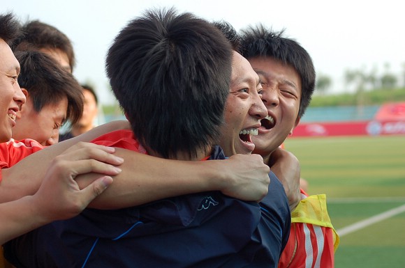 下半场比赛接近尾声,第45分钟时,我方右路队员射门,对方守门员再次扑球脱手,我方17号队员张树再次把握住难得的机会,轻推皮球入网,将场上比分锁定在5:2。