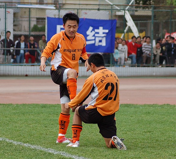 两位进球功臣8号袁微和21号张淼以“擦鞋”的特殊方式在庆祝进球。