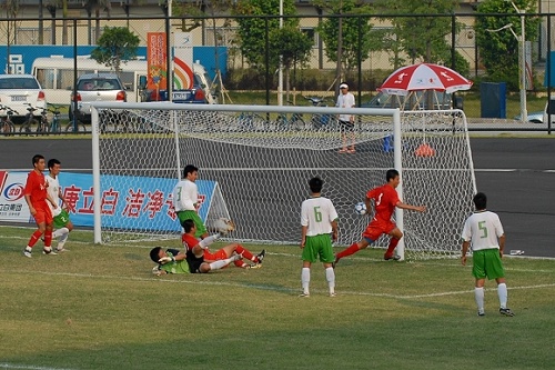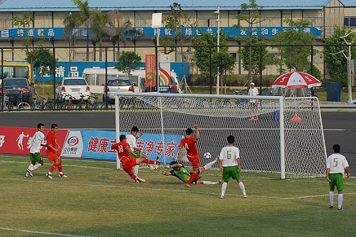 米兰队前锋18号杨思源和后卫3号卢斌双箭齐发,抢点门前,并由卢斌将对方守门员脱手之球补射网内。