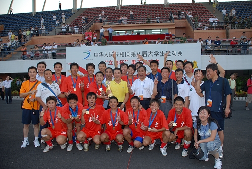 7月25日下午,在广州大学城举行的第八届全国大学生运动会足球赛的决赛中,我校足球队代表北京市大学生以1:0击败广东队,首次获得此项赛事全国冠军!可喜可贺!