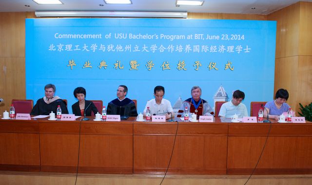 首先,梅院长对前来参加典礼的嘉宾及师生表示热烈欢迎,并宣布典礼开始。随后,蒋院长宣读了获得犹他州立大学学士学位的80名学生名单,犹他州立大学副教务长Robert W. Wagner教授等为全体毕业生颁发犹他州立大学学士学位证书并一一合影留念。Dwight Israelsen教授代表犹他州立大学亨茨曼商学院授予柯伊玲同学2014年度杰出毕业生称号,并颁发杰出毕业生奖牌。之后,毕业生代表边卓琳同学发言,毕业生王兆琳同学母亲赵丽莉女士发言以及教师代表余晓泓副教授发言。