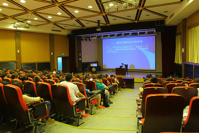 刘国民教授先从儒家思想的精髓出发,阐述了儒学与我国民主之间的联系,并从学术角度探讨了“民主”的内涵,分析了民主政治的现状,提出了我国践行人民民主的现实意义。又从儒家的德治政治角度,对民主践行者提出了更高的素质要求。刘教授慷慨激昂地演讲赢得了在座所有老师与学生的热烈掌声。