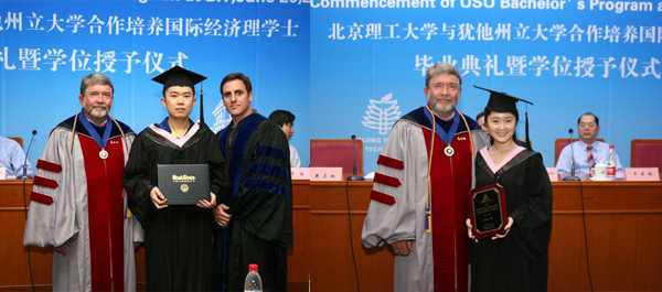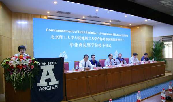 2013年6月20日下午,国际教育合作学院在理工国际教育交流大厦报告厅隆重举行了米兰milan官方网站与犹他州立大学合作办学项目第七届学生毕业典礼。出席毕业典礼的有犹他州立大学Jon Hunstman商学院副院长Frank Caliendo博士、中国项目主任Dwight Israelsen博士,米兰milan官方网站国际交流合作处处长王庆林教授、国际教育合作学院院长梅文博教授、罗佳书记、明道福副院长、蒋志湘副院长、学院部分教职工、全体毕业生、部分学生家长以及犹他州立大学来京访学的学生代表团。典礼由蒋志湘副院长主持。