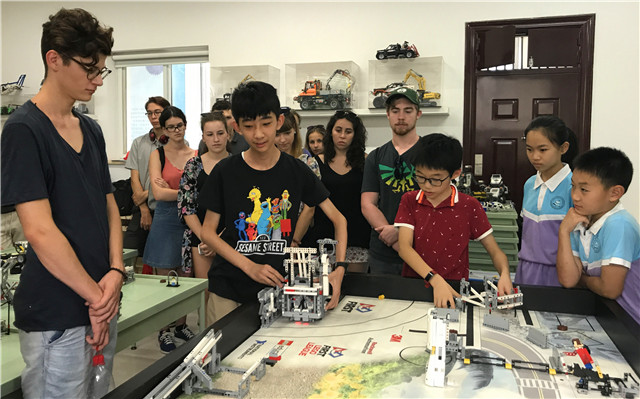 在附小同学们参观了棒球队、机器人教室等,在机器人教室里小学生代表给留学生朋友们展示了如何指挥机器人一步步成功地完成指令,机器人精彩的表现令留学生大开眼界,惊呼“中国的小学生太聪明,太厉害了!”。