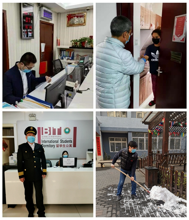 春节,本是家人团聚的日子。而疫情发生后,很多订好车票准备回家过年的公寓管理人员毅然退票,主动提出放弃休假,决心继续坚守岗位。公寓经理滕飞一天驱车1400公里迅速返岗,第一时间落实防控任务、合理排班上岗、筹措抗疫物资,做好各项后勤保障。“心里牵挂着这些外国孩子,我们知道疫情很严峻,所以这个时候我们绝不能休息。在与大家一起奋战的日子里,度过了我人生中最难忘的生日。”公寓副经理肖忠建诚挚的话语代表了全体公寓管理人员的心声和决心。全体管理人员承诺要坚守岗位、绝不掉队,全身心投入到疫情防控工作中。