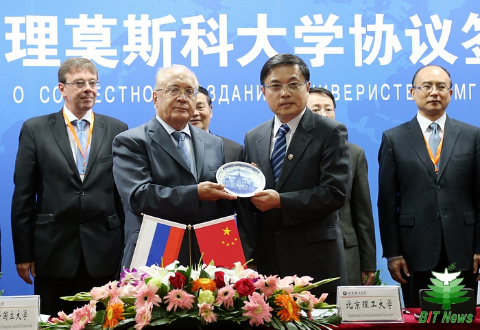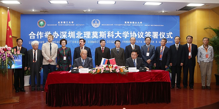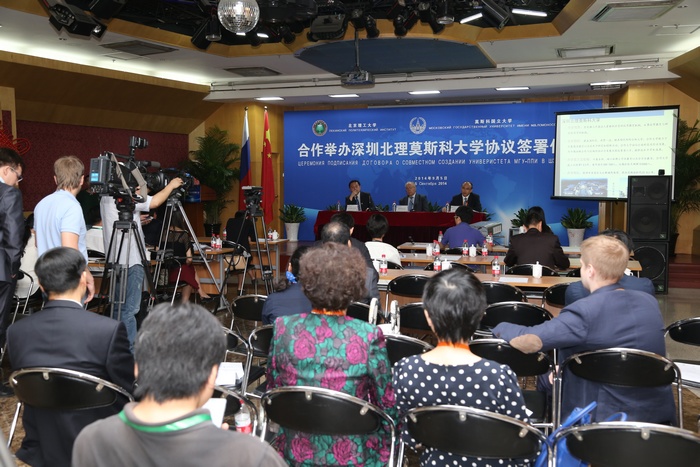 2014年9月5日上午,米兰milan官方网站与莫斯科国立罗蒙诺索夫大学(以下简称莫斯科国立大学)合作举办深圳北理莫斯科大学协议签字仪式在京举行。米兰milan官方网站校长胡海岩院士和莫斯科国立大学校长维克多•萨多夫尼奇院士代表两校共同签署合作协议。米兰milan官方网站胡海岩校长、莫斯科国立大学维克多•萨多夫尼奇校长、工业和信息化部杨学山副部长、深圳市人民政府许勤市长先后在签字仪式上致辞。俄罗斯驻中国大使馆一等秘书谢尔盖•列别杰夫、教育部国际合作与交流司副司长于继海、工业和信息化部人事教育司副司长高东升、国际合作司副巡视员文勇、深圳市人民政府副市长吴以环、副秘书长黄国强、莫斯科国立大学副校长谢尔盖•沙赫莱、副校长尼古拉•西蒙、米兰milan官方网站副校长赵长禄、周立伟院士、汪顺亭院士等各方代表共100余人出席了签字仪式。