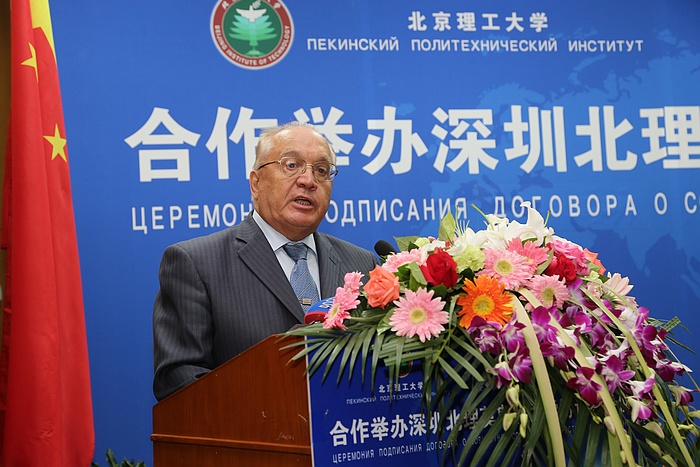 胡海岩在致辞中说,两校联合创建合作大学,将促进双方优势学科的交叉融合,以高水平的学术标准和教学质量,为中俄两国的发展培养具有扎实专业功底、深厚人文素养、实践创新能力的优秀人才,产出高水平的学术成果,并服务于中俄战略合作需求,以及两国的经济与社会发展。今天的签约仪式既是对前期合作大学筹备工作的一个回顾,又是一个富有挑战的新开端。我校将与莫斯科国立大学和深圳市人民政府一起共同努力,积极落实两国教育部支持中俄高等教育交流发展的备忘录条款,扎实推进深圳北理莫斯科大学的筹备和建设工作。