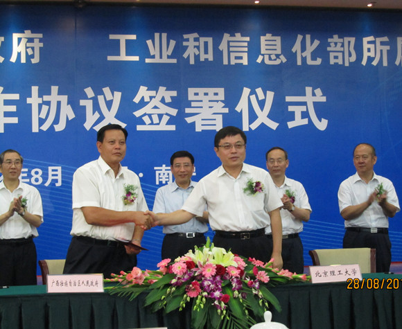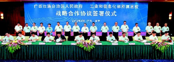 2012年8月28日,广西壮族自治区人民政府—工业和信息化部所属高校战略合作协议签署仪式在广西南宁举行。广西壮族自治区党委书记郭声琨等出席活动,工业和信息化部部长苗圩、广西壮族自治区人民政府主席马飚致辞,并共同见证签署仪式。