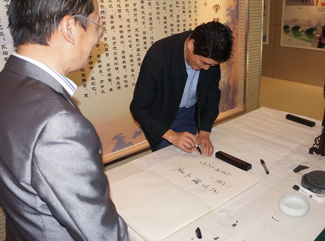 赵显利副校长向河南理工大学赠送礼物“欣欣向荣”