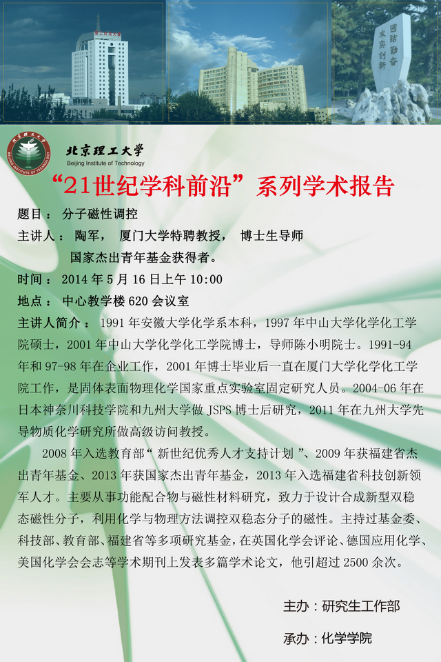 化学学院“21世纪学科前沿”陶军教授学术报告预告