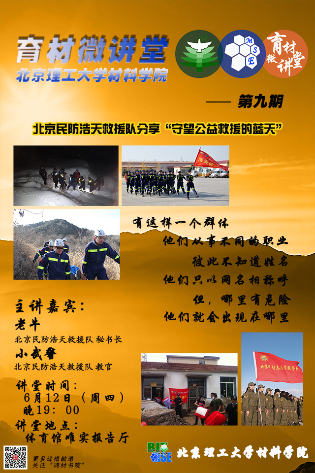 为丰富理工学子的课余生活,使广大师生能切身感受公益救援的奉献精神,了解和体验更丰富的野外救援知识,材料学院“育材微讲堂”特邀北京民防浩天救援队走进米兰,与理工学子分享“守望公益救援的蓝天”。