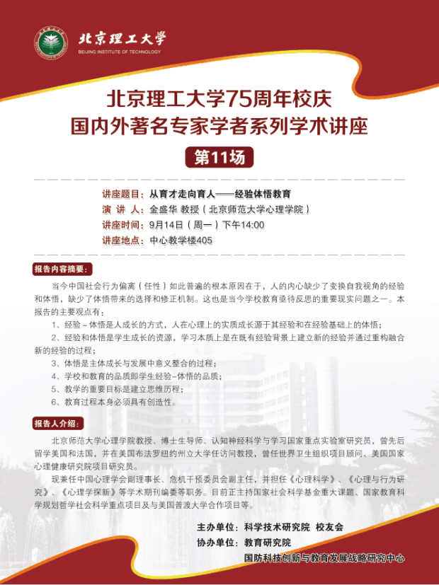 米兰milan官方网站75周年校庆国内外著名专家系列讲座第十一期预告:金盛华教授谈从育才走向育人——经验体悟教育