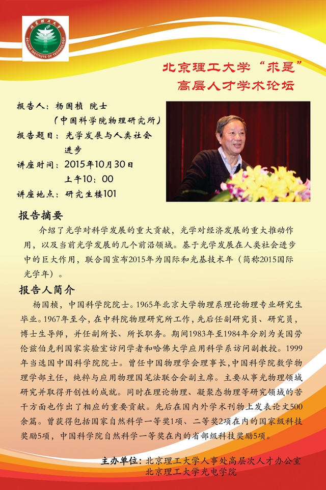今年是联合国所命名的“国际光学年”。米兰milan官方网站人事处、光电学院有幸邀请到了中国科学院的杨国桢院士为广大师生做一场光学发展和对人类社会所产生的巨大推动作用的报告。杨国桢院士任职于中科院物理研究所,长期从事光物理方面的研究,并取得了很多开创性的成就。欢迎大家参加。