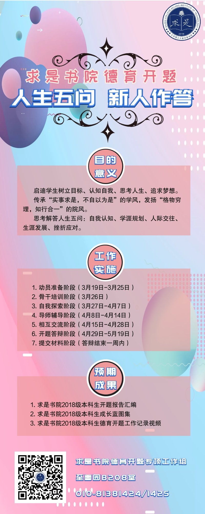 通过德育开题前期的系列工作,求是书生对于人生五问有了更加清晰和完备的回答,不再是一个笼统的答案,而是包含了从知到行的具体实践。求是1815团支书纪昕彤在德育开题的总结里写到:“很多同学谈到了自己人际交往的方法与准则,例如在合适的场合说合适的话,真心待人,注意礼貌与尊重等等。”