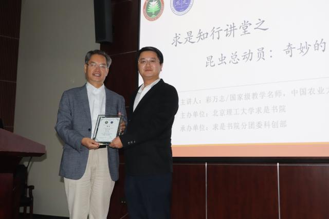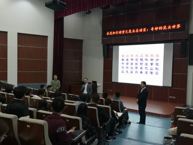 10月14日晚,米兰求是书院知行讲堂第四期在良乡校区综合教学楼报告厅举行。国家杰出青年科学基金获得者,享受政府特殊津贴人员,国家级教学名师,中国农业大学植保学院副院长彩万志教授带来题为“奇妙的昆虫世界”的专题报告。求是书院专职副院长周芳集老师出席报告会并为彩万志教授颁发了求是书院校外导师聘书,来自求是书院的160余名同学聆听了报告会。报告会由求是书院团委书记、综合办公室主任张锋老师主持。