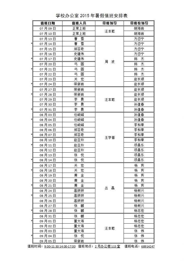 学校办公室2015年暑假值班表