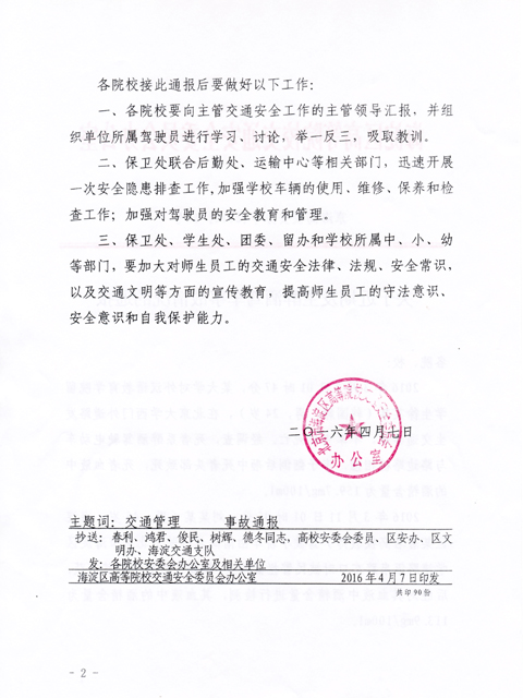 为预防和减少因酒驾导致的道路交通事故,现转发海淀区高等院校交通安全委员会办公室《关于近期发生醉酒驾车事故情况的通报》(京海高校办字[2016]6号),请各学院、部、处组织所属师生员工、驾驶员做好以下工作:
