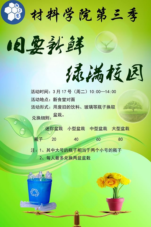 2015年植树节过后,材料学院第三季“旧要新鲜绿满校园”环保公益活动将如期而至。用平时收集的废旧瓶子,换取生机盎然的盆栽,绿色环保一举两得。带上你的瓶子来做环保代言人吧!