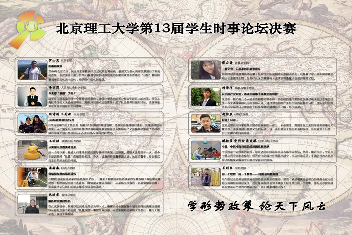 评论题目由学生自拟,主题积极向上,内容涵盖2016年1月以来发生的政治、经济、军事、科技、文化、体育、教育等国际、国内以及学校的时事热点问题。(如新南向政策、美国大选、小黄车与共享经济、欧洲难民危机、“墨子号”卫星发射等)