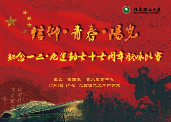 我校“纪念一二•九运动七十七周年歌咏比赛”决赛将于 2012年12月9日18:40在 中关村校区体育馆举行,包括自动化学院、管理与经济学院等进入决赛的14个学院合唱队将用歌声表达对先烈的缅怀和未来的美好向往。期间我校大学生艺术团、学生社团联合会也有精彩的节目呈现。