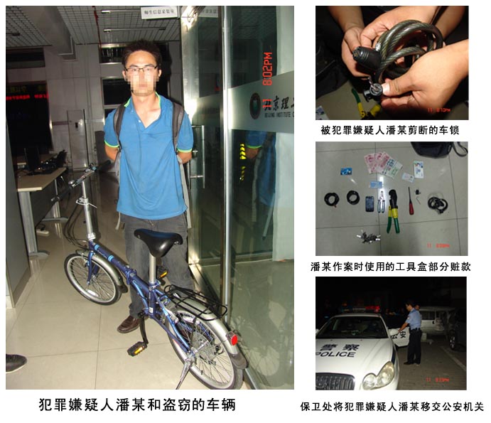 据潘某交代:自己是天津某高校的毕业生,今年26岁。已经在北京各高校共作案10余起,其中8月19日、8月29日、9月6日、9月11日在我校作案四起;除9月11日作案被当场抓获外,其余在我校盗窃的自行车均已通过网络销赃。另外,潘某还供述,其在北京交通大学盗窃3辆自行车,在北京传媒大学盗窃1辆自行车;所有盗窃的车型几乎都是捷安特、美利达等高档自行车,共获得赃款5000余元。目前,潘某己被公安机关刑事拘留。