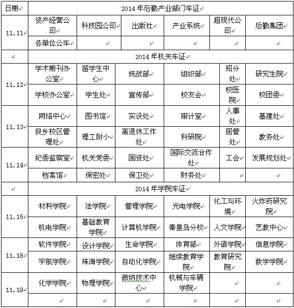 3.  自11月11日起,各单位到停车公司(菜市场北门对面)进行交费并领取2014年停车证。各单位领取车证时间安排如下: