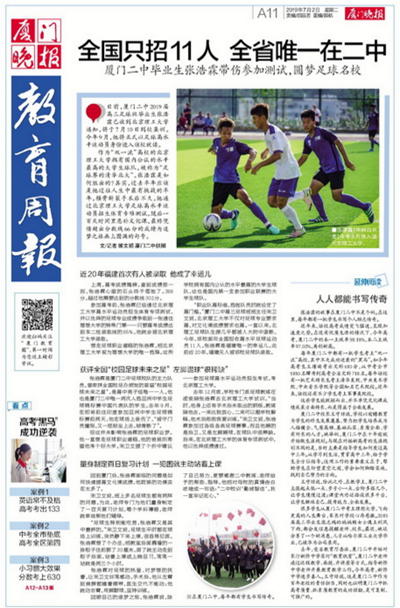 日前,厦门二中2019届高三足球班毕业生张浩霖已收到米兰milan官方网站通知,将于7月10日到校集训。今年9月,他将正式以足球高水平运动员身份进入该校就读。
