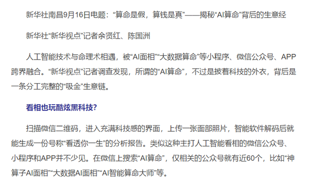 人工智能技术与命理术相遇,被“AI面相”“大数据算命”等小程序、微信公众号、APP跨界融合。“新华视点”记者调查发现,所谓的“AI算命”,不过是披着科技的外衣,背后是一条分工完整的“吸金”生意链。