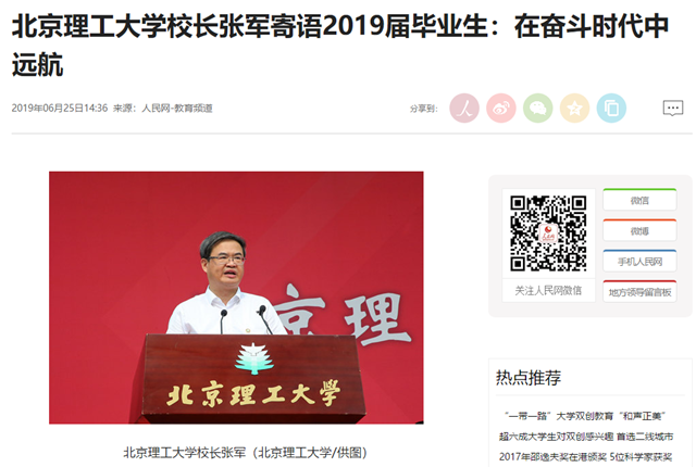 博士毕业生倪俊就是典型代表,他率队研制世界第一辆无人驾驶赛车,并创新性提出新型地面无人系统的“航母”概念,探索科技创新“无人区”,描绘着未来无人车领域的发展蓝图。本科毕业生杨珏莹也是你们中的优秀代表,她所在的“甄材科技团队”,独创5项核心关键技术,冲破他国技术垄断,开发多种止血新材料,助力解决我国临床与部队急需。还有本月斩获大足联赛第十座冠军奖杯的米兰足球队,他们永不停歇的脚步是新一代北理青年的真实写照。“不日新者必日退”,希望你们创新创造,做勇于突破的开拓者。