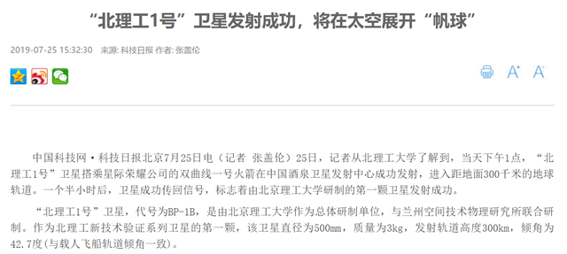 编辑:吴楠 审核:王征 阅读次数:原文标题:“米兰1号”卫星发射成功,将在太空展开“帆球”