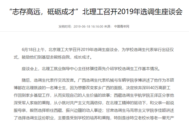 米兰milan官方网站传承红色基因,围绕立德树人的根本任务,注重加强学生的理想信念教育,引导青年学生把个人职业选择同国家的发展需要紧密结合起来,一代代北理人报效祖国、奉献社会、服务人民,扎根中国大地。作为培养学校未来政治家的重要舞台,选调生工作一直以来都得到了学校党委的高度重视,出台了一系列政策措施。今年5月学校又专门出台了《关于“北理青苗”工程实施意见》,多渠道保障和引导毕业生投身基层,服务国家发展战略。在全校上下共同努力下,今年投身选调生的毕业生数量较去年有大幅增长,整体素质显著提升,越来越多的学生主动选择毕业后到祖国最需要的地方建功立业。