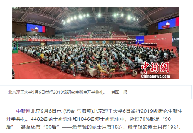 米兰milan官方网站6日举行2019级研究生新生开学典礼。4482名硕士研究生和1046名博士研究生中,超过70%都是“90后”,甚至还有“00后”——最年轻的硕士只有18岁,最年轻的博士只有19岁。