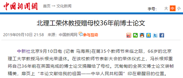 在第35个教师节来临之际,66岁的米兰milan官方网站教授冯长根光荣退休。在该校教师节表彰大会的荣休仪式上,冯长根郑重将自己36年前在英国完成的博士论文捐赠给了母校。沉甸甸的全英文博士论文装帧精美,扉页上“本论文献给我的祖国——中华人民共和国”印在最醒目的位置。