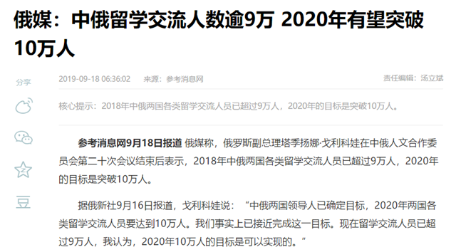 俄媒称,俄罗斯副总理塔季扬娜·戈利科娃在中俄人文合作委员会第二十次会议结束后表示,2018年中俄两国各类留学交流人员已超过9万人,2020年的目标是突破10万人。