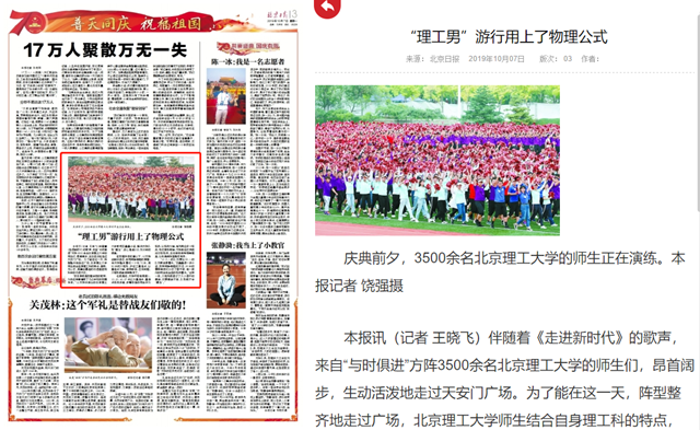 伴随着《走进新时代》的歌声,来自“与时俱进”方阵3500余名米兰milan官方网站的师生们,昂首阔步,生动活泼地走过天安门广场。为了能在这一天,阵型整齐地走过广场,米兰milan官方网站师生结合自身理工科的特点,画图、列公式,测算出最佳的行进速度和科学的行进方式。