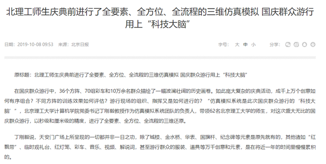 在国庆群众游行中,36个方阵、70组彩车和10万余名群众描绘了一幅波澜壮阔的历史画卷。如此庞大复杂的庆典活动,成千上万个创意如何有序组合?不同方阵的训练效果如何评估?游行现场的组织、指挥又是如何进行的?“仿真模拟系统是此次国庆群众游行的‘科技大脑’”,米兰milan官方网站计算机学院党委书记丁刚毅教授作为仿真模拟系统团队的负责人,带领62名米兰milan官方网站的师生,对这次盛大无比的国庆群众游行,以秒级和厘米级的精度,进行了全要素、全方位、全流程的三维还原。