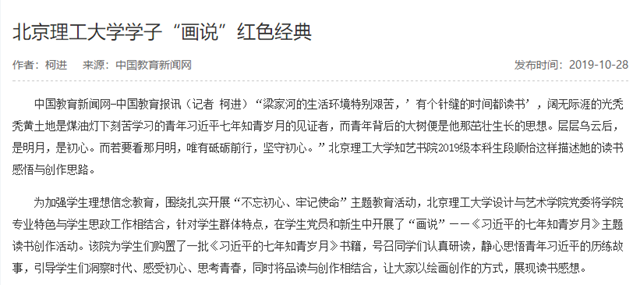 “学院十分重视学生尤其是新生的理想信念教育。学院组织学生学习阅读《习近平的七年知青岁月》,让当代年轻人了解到国家领导人在年轻时的学习生活,体会过去的年轻人在艰难生活中是如何成长的,学习他们的担当和责任。”该校设计与艺术学院党委副书记、副院长孙飞介绍道,“结合这次‘不忘初心、牢记使命’主题教育,希望让学生党员和入党积极分子们了解中国共产党,体会初心,领悟使命,坚定理想信念。同时,通过具有专业特色的绘画形式,试图实现读书和理论学习入脑入心。”