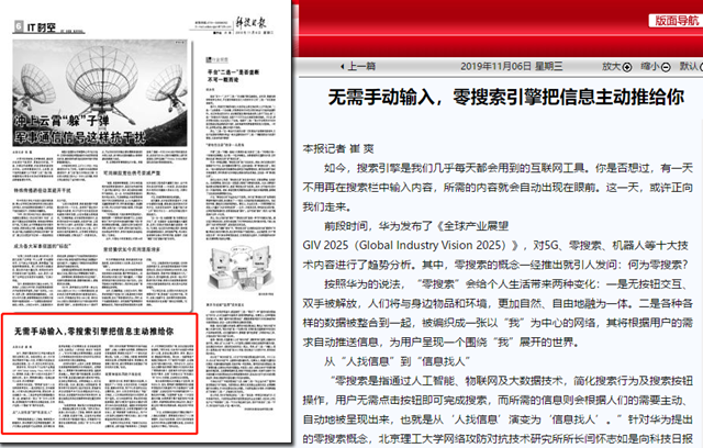 “零搜索是指通过人工智能、物联网及大数据技术,简化搜索行为及搜索按钮操作,用户无需点击按钮即可完成搜索,而所需的信息则会根据人们的需要主动、自动地被呈现出来,也就是从‘人找信息’演变为‘信息找人’。”针对华为提出的零搜索概念,米兰milan官方网站网络攻防对抗技术研究所所长闫怀志如是向科技日报记者解释道。