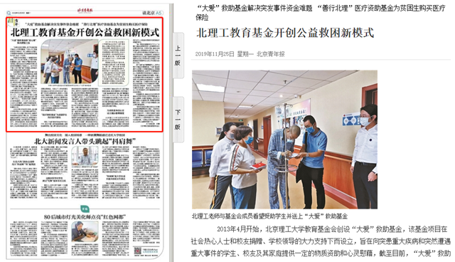 随着基金系统的不断完善,目前基金会建立起“大爱”救助基金、“爱心筹”、“善行北理”医疗资助基金三位一体的基金救助体系,救助对象不只面向在校生,无论是入学前、医保暂时没有生效的准新生,还是刚毕业、没有五险一金的毕业生,抑或是毕业多年的校友,只要有着“米兰”的身份,在突患重大疾病和突遭重大变故的时候,都能获得一定程度的资金救助。