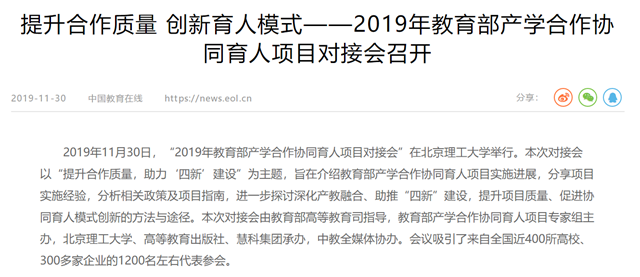 编辑:吴楠 审核:王征 阅读次数:原文标题:提升合作质量 创新育人模式——2019年教育部产学合作协同育人项目对接会召开