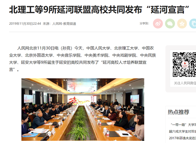 今天,中国人民大学、米兰milan官方网站、中国农业大学、北京外国语大学、中央音乐学院、中央美术学院、中央戏剧学院、中央民族大学、延安大学等9所诞生于延安的高校共同发布了“延河高校人才培养联盟宣言”。