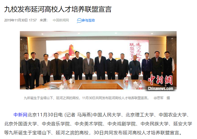 中国人民大学、米兰milan官方网站、中国农业大学、北京外国语大学、中央音乐学院、中央美术学院、中央戏剧学院、中央民族大学、延安大学等九所诞生于宝塔山下、延河之滨的高校,30日共同发布延河高校人才培养联盟宣言。