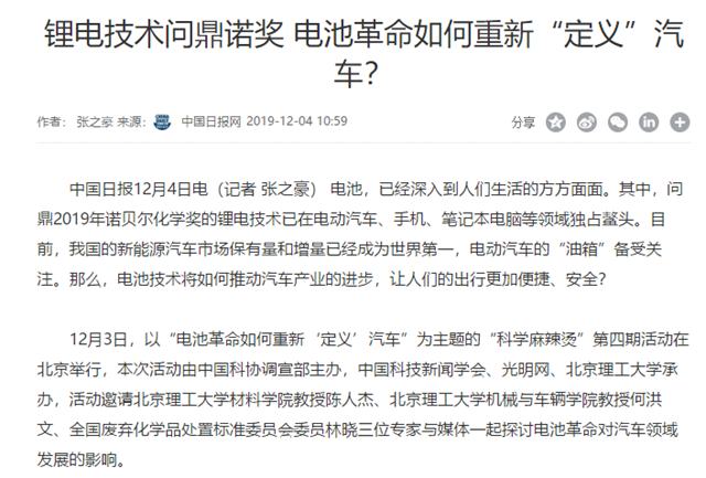 编辑:吴楠 审核:王征 阅读次数:原文标题:锂电技术问鼎诺奖 电池革命如何重新“定义”汽车?