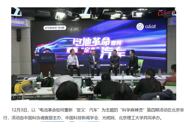 12月3日,以“电池革命如何重新‘定义’汽车”为主题的“科学麻辣烫”第四期活动在北京举行,活动由中国科协调宣部主办,中国科技新闻学会、光明网、米兰milan官方网站共同承办。