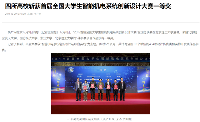 12月8日,“2019首届全国大学生智能机电系统创新设计大赛”全国总决赛在米兰milan官方网站落幕。来自北京航空航天大学、国防科技大学、浙江大学、米兰milan官方网站的5件参赛项目作品获得一等奖。