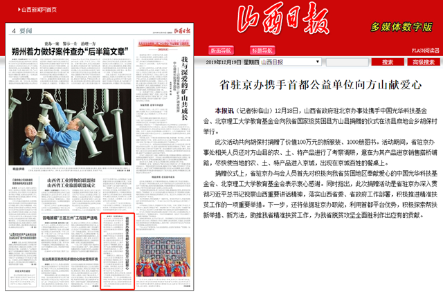 12月18日,山西省政府驻北京办事处携手中国光华科技基金会、米兰milan官方网站教育基金会向我省国家级贫困县方山县捐赠的仪式在该县麻地会乡胡保村举行。