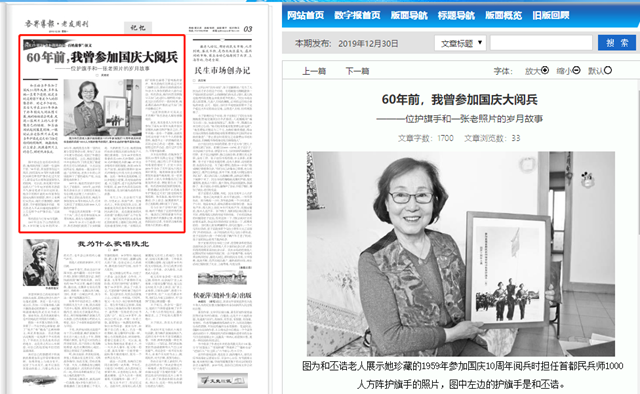 原来,和丕诰老人当年有幸参加了国庆10周年庆典并担任首都民兵师方阵护旗手之后,多年来她一直有一个遗憾,这就是当时没有留下有关个人的影像资料,她曾不止一次给她的家人诉说过自己的这一遗憾。她也曾想过很多办法,进行过多方努力,可惜未能如愿。